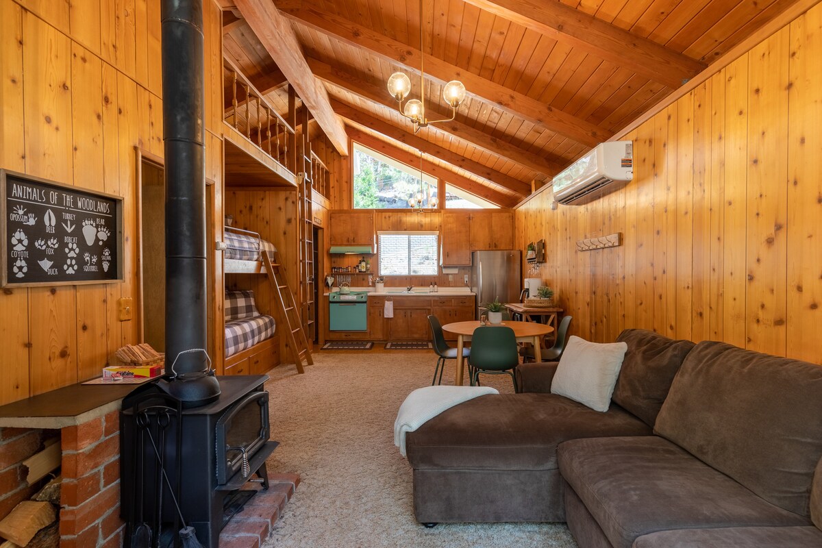 Ven a escapar a nuestra cabaña recién renovada de 3 dormitorios y 2 baños con aire acondicionado central y calefacción, y ubicada cerca del pueblo, el lago, el tobogán alpino, las estaciones de esquí y las rutas de senderismo. Nuestra casa incluye muchos detalles y comodidades bien pensados: la escapada perfecta para familias, parejas o amigos. Techos altos abovedados con vigas de madera, chimenea de leña, juegos de mesa, tocadiscos de vinilos y una cocina isla totalmente equipada. La acogedora terraza trasera está ubicada bajo luces de cuerda y la casa está equipada con un cargador de vehículos eléctricos de nivel 2.