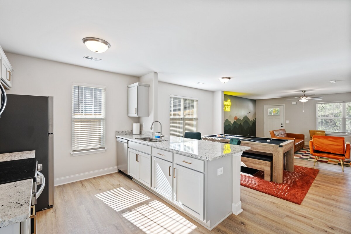 Welcome to our modern retreat just steps away from the famous Swamp Rabbit Trail, which takes you into downtown Greenville or Travelers Rest. This IG-worthy experience boasts a vibrant local-themed mural, LED lights, a pool/ping pong table for endless entertainment, and a spacious backyard adorned with a pergola and fire pit. With 2 bedrooms and 2.5 bathrooms, our beautifully designed home offers comfort and style for family visits and getaways.