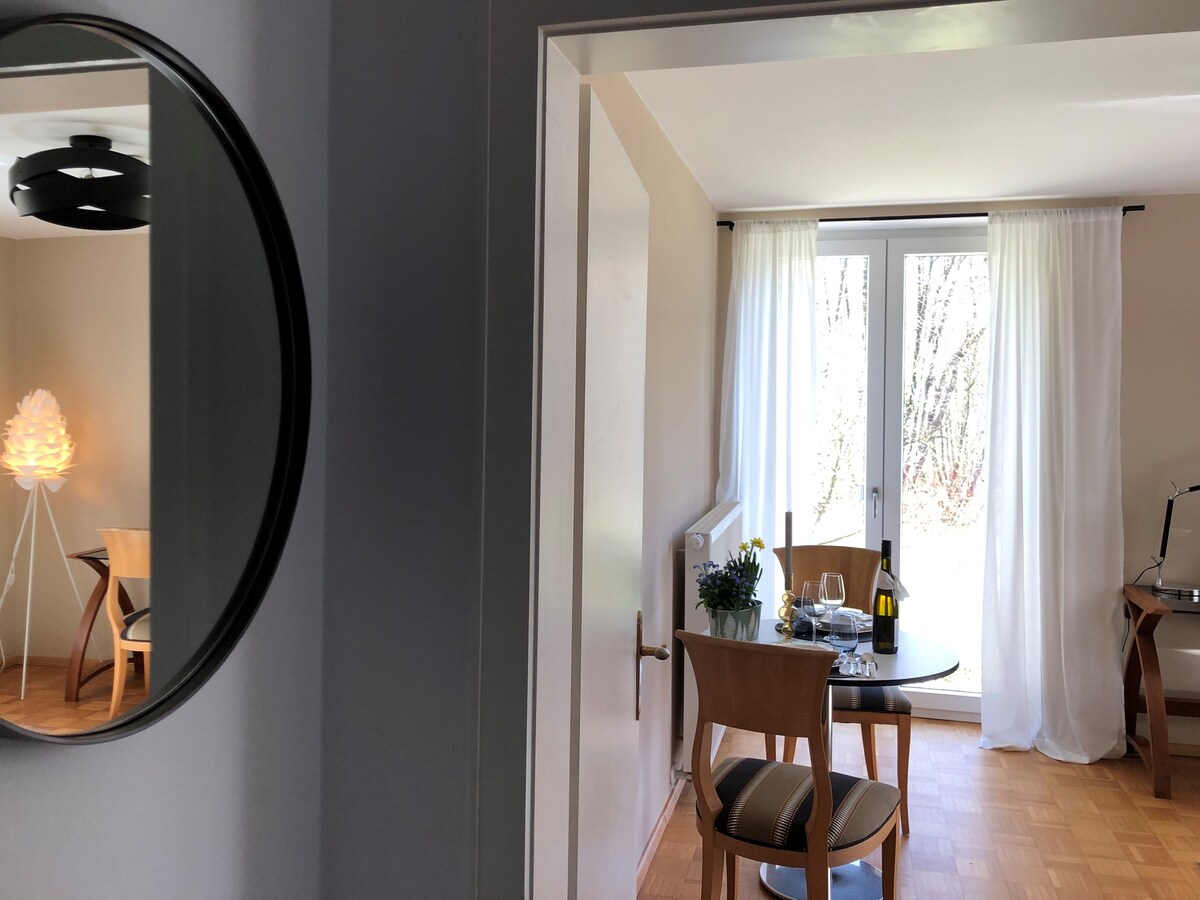 ¡Un luminoso apartamento de 1 habitación te espera!El amanecer desde la cama con vistas al lago en la reserva natural hace que la ubicación sea única. Observe el barco de vapor y disfrute de su propia terraza con barbacoa. Una cocina totalmente equipada, una cómoda cama de 2x2 m con mucho espacio para soñar.Televisor inteligente, Internet de alta velocidad, escritorio. Sofá cama ancho, cuna disponible bajo petición. El baño especial tiene ducha, 2 lavabos, WC. Punto de carga eléctrica a 2 km. Punto de carga rápida a 4 km.