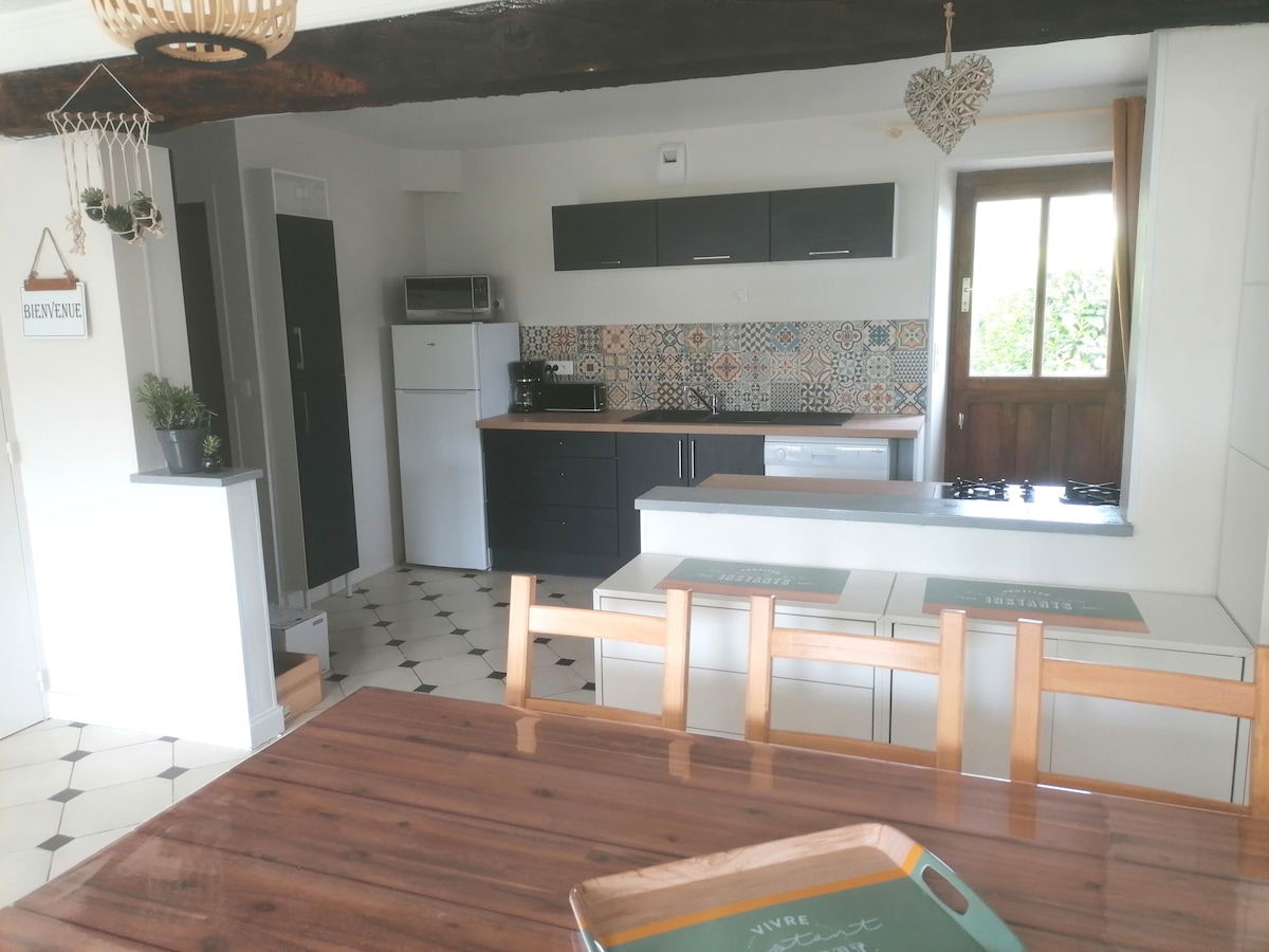 Pequeño alojamiento de 40 metros cuadrados contiguo a nuestra casa con entrada independiente, con un dormitorio equipado con una cama de matrimonio. La sala de estar está equipada con un sofá cama. posibilidad de tener el equipo para bebé (cama, silla, olla…) acceso a un exterior, cocina equipada con nevera, placa de inducción y microondas