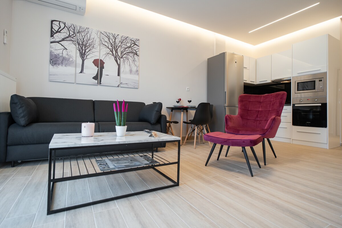 Un apartamento totalmente renovado en una ubicación ideal en el centro de Larissa, entre las principales calles peatonales y la estación de tren (OSE). Hay fácil aparcamiento en la zona, cerca del apartamento.