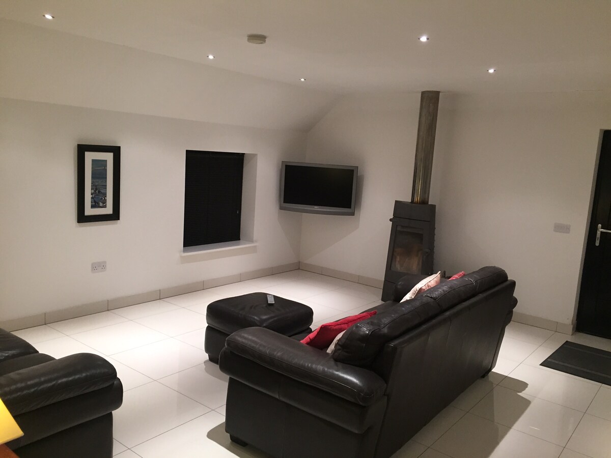 Una escapada perfecta junto al agua durante todo el año para dos. En la orilla del agua, con impresionantes vistas al mar, las montañas y las vistas panorámicas. A solo 5 minutos en auto de una gran ciudad comercial y a 20 minutos de la ciudad de Belfast. Se admiten perros. Cerca de los principales campos de golf. Elegante. Techos abovedados, grandes ventanales de piso a techo, puertas que se abren a una gran terraza orientada al sur para tomar algo al atardecer o hacer un asado y un balcón desde la suite principal. Asientos al aire libre para relajarse o cenar. Cocina de leña en la sala de estar.