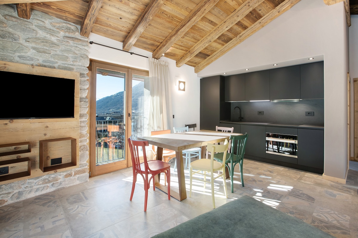 Precioso apartamento en dos niveles con vista panorámica, rodeado de montañas, cerca del centro histórico. A 10 minutos en coche de Bormio, pistas de esquí y baños termales. A 15 minutos en coche de Tirano, donde salir para una increíble excursión a St. Moritz (Suiza) en el famoso tren rojo de Bernina. Planta principal: gran cocina comedor totalmente equipada, cómoda sala de estar con un sofá cama doble y un sofá cama individual. Arriba: encantadores techos inclinados, dormitorio triple con muebles de montaña típicos.