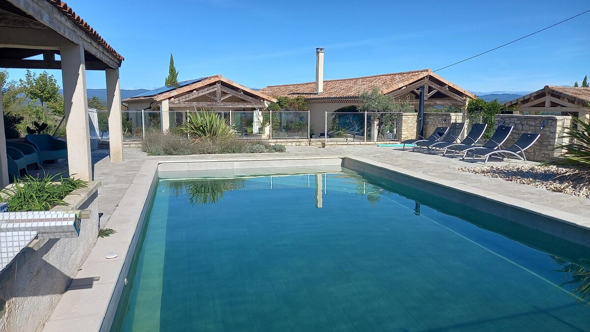 Relax in this 4★ villa with exceptional views in a quiet, private neighborhood with no overlooking neighbors. Brand-new villa with 2 bedrooms, a spacious living area with a fully equipped kitchen, a bathroom with Italian-style shower, air conditioning, fiber Wi-Fi, TV, and a covered terrace. 5 × 10 m infinity pool with travertine sun deck (shared with the owner). Shops 2 minutes away by car. Hiking trails, river swimming, canoeing, picturesque villages, and tourist attractions nearby.