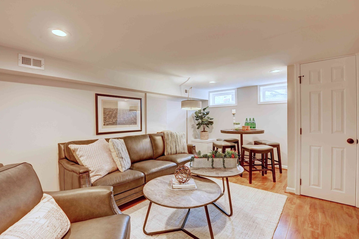 Un bonito apartamento tipo estudio en el sótano de una casa recién reformada. Los huéspedes tienen una entrada privada con su propio baño privado. También puedes utilizar una lavadora y secadora de tamaño completo. Otros servicios incluyen un bar de honor surtido de cerveza y vino, un juego de estilo arcade con más de 200 títulos populares, incluido Ms. Pac Man, y café/té. Ten en cuenta que vivimos arriba, pero el espacio es privado. Está separado por una escalera y una puerta con cerradura. Es comparable a una habitación de hotel, pero más agradable.