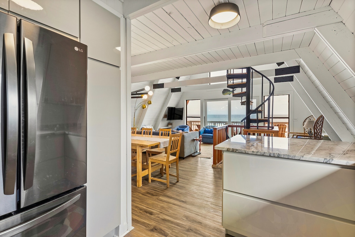 Fabulosamente actualizado en 1970, un marco en la playa con muchos toques modernos y de lujo en todas partes. El nivel más bajo está equipado con una habitación con cama tamaño queen, una sala de estar (el futón también se convierte en cama) con TV y baño. El nivel principal cuenta con un dormitorio queen, baño, sala de estar muy cómoda con mesa de comedor para ocho, la cocina moderna equipada con todo lo necesario para una estancia corta o larga! El loft de arriba tiene dos camas tamaño queen y una cama de día doble. ¡Afuera, el océano te espera!
