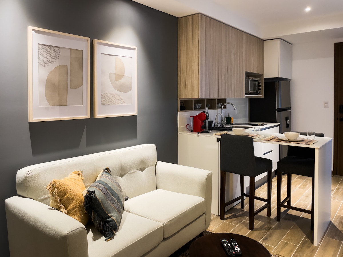 Apartamento entero y moderno. Cuenta con 2 balcones, 1 habitación con cama Queen y baño privado, sala con sofá cama, comedor, cocina totalmente equipada, lavadora y secadora de ropa. Con 2 smart TV de 42” para entretenimiento y wifi . Incluye 1 parqueo gratuito en las instalaciones. **El edificio cuenta con Supermercado y restaurantes**