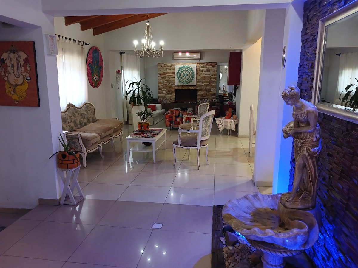 Hermosa casa con lo necesario para disfrutar en familia: - Piscina climatizada abierta todo el año - 3 Habitaciones - 3 baños (dos con ducha) - Lavandería - Hermosa cocina y comedor - Smart TV 55" y 32" + Apps - WiFi - Jacuzzi p/ 1 persona - Quincho equipado con AA, baño, churrasquera y horno. - Jardines. - Cochera privada Buena ubicación en un barrio tranquilo, con una variedad de comercios cercanos (incluidos supermercados). La casa se encuentra a 8 min del aeropuerto y 12 del Centro de Mdz