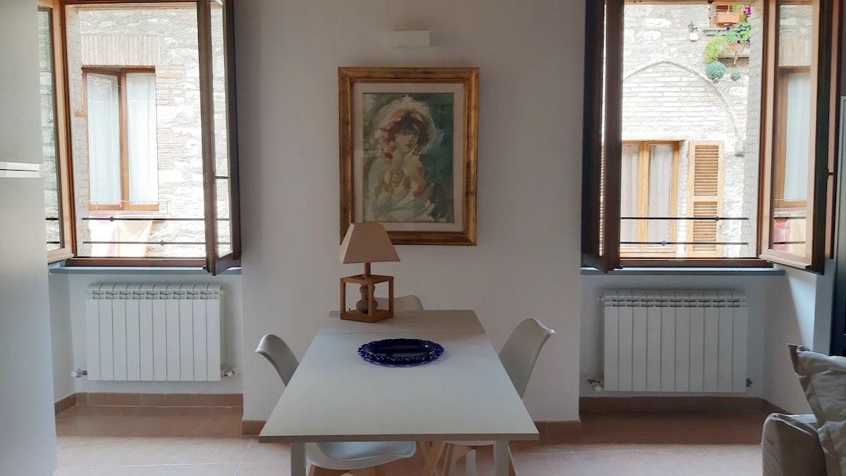 Apartamento suite en el corazón de Gubbio, en dos niveles, totalmente renovado, de unos 80 metros cuadrados, cocina equipada con placa de inducción, nevera, lavavajillas, horno microondas, amplio salón con TV de 55", wifi incluido, dormitorio doble de estilo moderno con cama suspendida y luces led, dormitorio con litera, sofá cama doble, baño moderno con ducha emocional, chorros de masaje, luces ambientales de cromoterapia. A dos pasos de pubs, restaurantes, monumentos, teleférico y del Sendero Franciscano.
