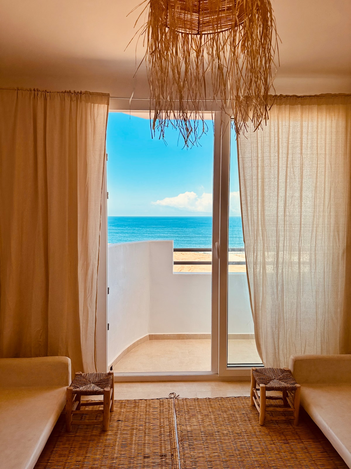 Appartement en rez-de-chaussée face à la mer avec vue imprenable. 2 chambres, salle de bain, cuisine ouverte sur le salon et la terrasse privée pour admirer les couchers de soleil, se détendre ou profiter des petits chats qui viennent sur le balcon. Lumineux grâce à son exposition sud-ouest, décor élégant avec tadelakt et meubles locaux. À deux pas des plages et du village berbère, idéal pour un séjour paisible, relaxant et proche de la nature.