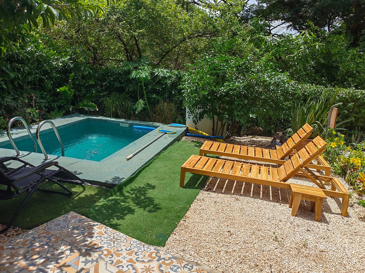 Apartamento cerca de la montaña en calle rural con un ambiente natural tropical , vecindario con privacidad, tranquilo a 15 minutos caminando a la playa del coco , cerca de supermercados , ideal para salir a andar en bici o correr , piscina pequeña para 4 o 5 personas privada , jardín con piedra , cocina completa para usar , baño con ducha abierta por lo que tendrás un experiencia diferente al tomar la ducha , espacio para trabajar , naturaleza .