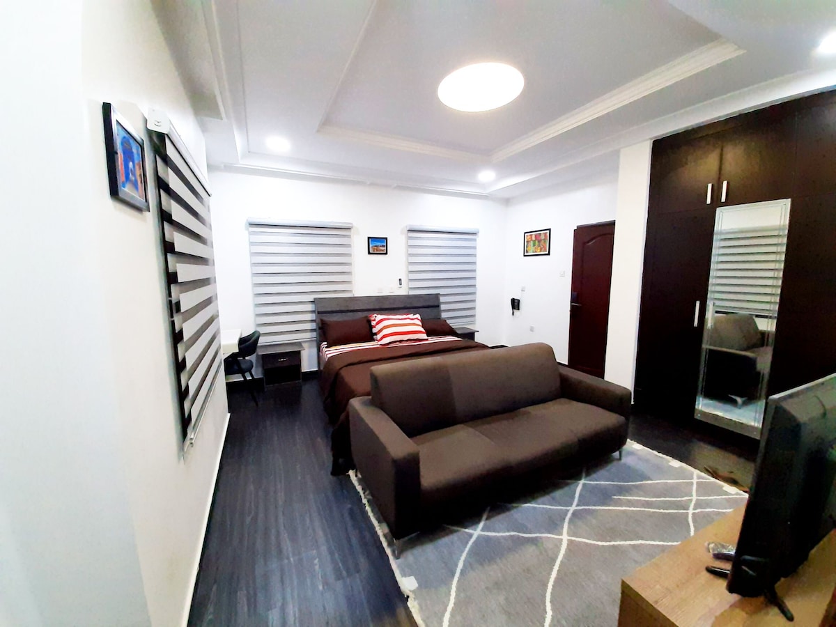 Contemporáneo, elegante, espacioso y funcional. La unidad de estudio funciona completamente con un inversor de energía solar, un generador de reserva y un suministro de electricidad relativamente estable. Equipado con TV inteligente, puerta inteligente, unidad de aire acondicionado, calentador de agua y una cocina de planta abierta totalmente equipada. Un lugar acogedor para tu estancia de escapada. La instalación tiene acceso completo a un gimnasio funcional, una piscina, una zona de juegos repleta de una mesa de billar, tenis de mesa y una zona de juegos en el pabellón.