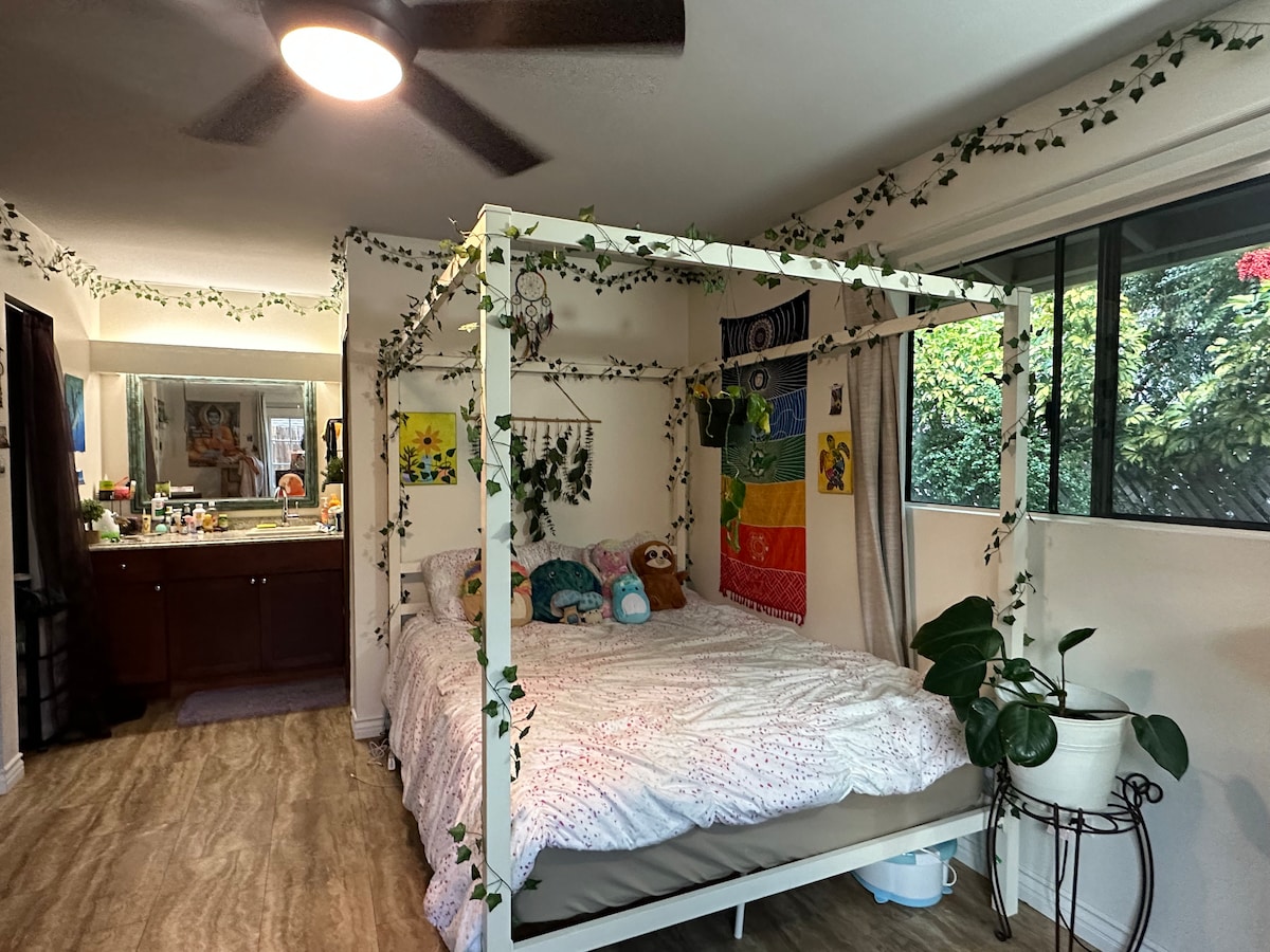 Welcome to this place of peace and plants. When the sun is shining, the room is well lit and no outside light is needed. Theres plants (real and fake) all around, giving a sense of calmness and nature. Theres a giant walk in closet and a nice, clean bathroom with a tub and shower combo. Outside, I have a hammock for your pleasure on the patio.