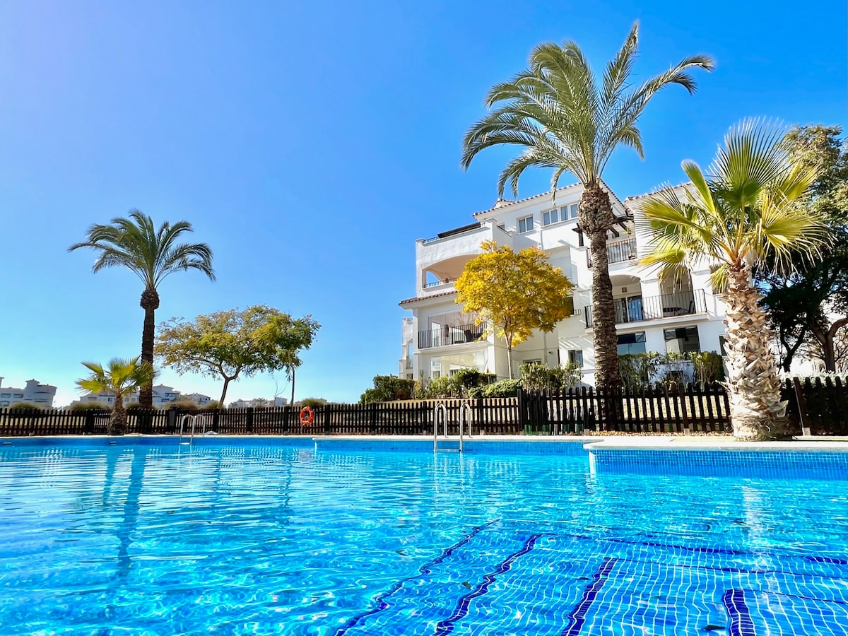 A well-equipped comfortable and homely apartment, we know you will love it just as much as we do. Newly furnished, 2 bedrooms , overlooking the pool with fantastic views of the holes 11 and 16 beyond. The Hacienda Riquelme resort is well established around the fantastic Jack Nicklaus designed golf course. There is a beautiful Club house with a bar, restaurant, supermarket, tennis courts, 19 pools and verdant gardens.