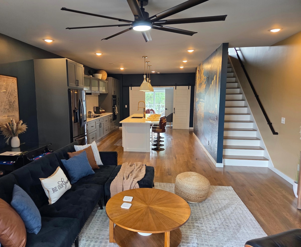 Discover Chattanooga from our new 3BR townhouse on the scenic Southside. Steps from Southside's dining, <2 miles to the Convention Center, Erlanger Hospital, UT Chattanooga, Warner Park, and just 2.5 miles to the TN Aquarium and Walnut St Bridge. Features include brand-new furnishings, a two-car garage, a dedicated workspace, and a luxurious top-floor master suite with a king bed and private patio. Your perfect base for city exploration!