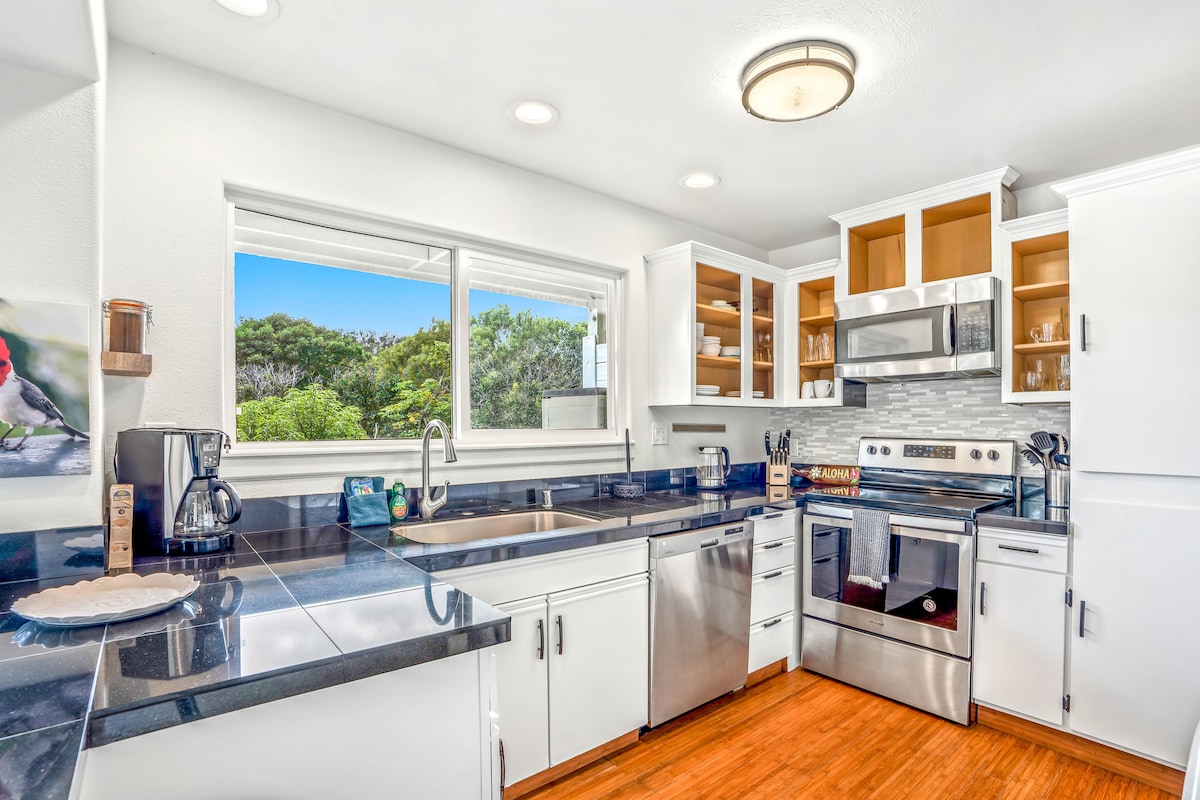 Este moderno y recién renovado refugio de playa para lunas de miel tiene impresionantes vistas panorámicas al mar y a la costa. Relájate en el sofá cama mientras contemplas la amplia vista desde el arrecife de Anini hasta el faro de Kilauea. Algunos han dicho que «se siente como estar en un barco en el mar» mientras presencian cómo las ballenas rompen en el océano y las olas rompen en el arrecife desde este lugar mágico. Una rara unidad de ático con techos altos, vistas desde todas las habitaciones, incluso el famoso Bali Hai desde la terraza. ¡Verdaderamente el sueño de una pareja!