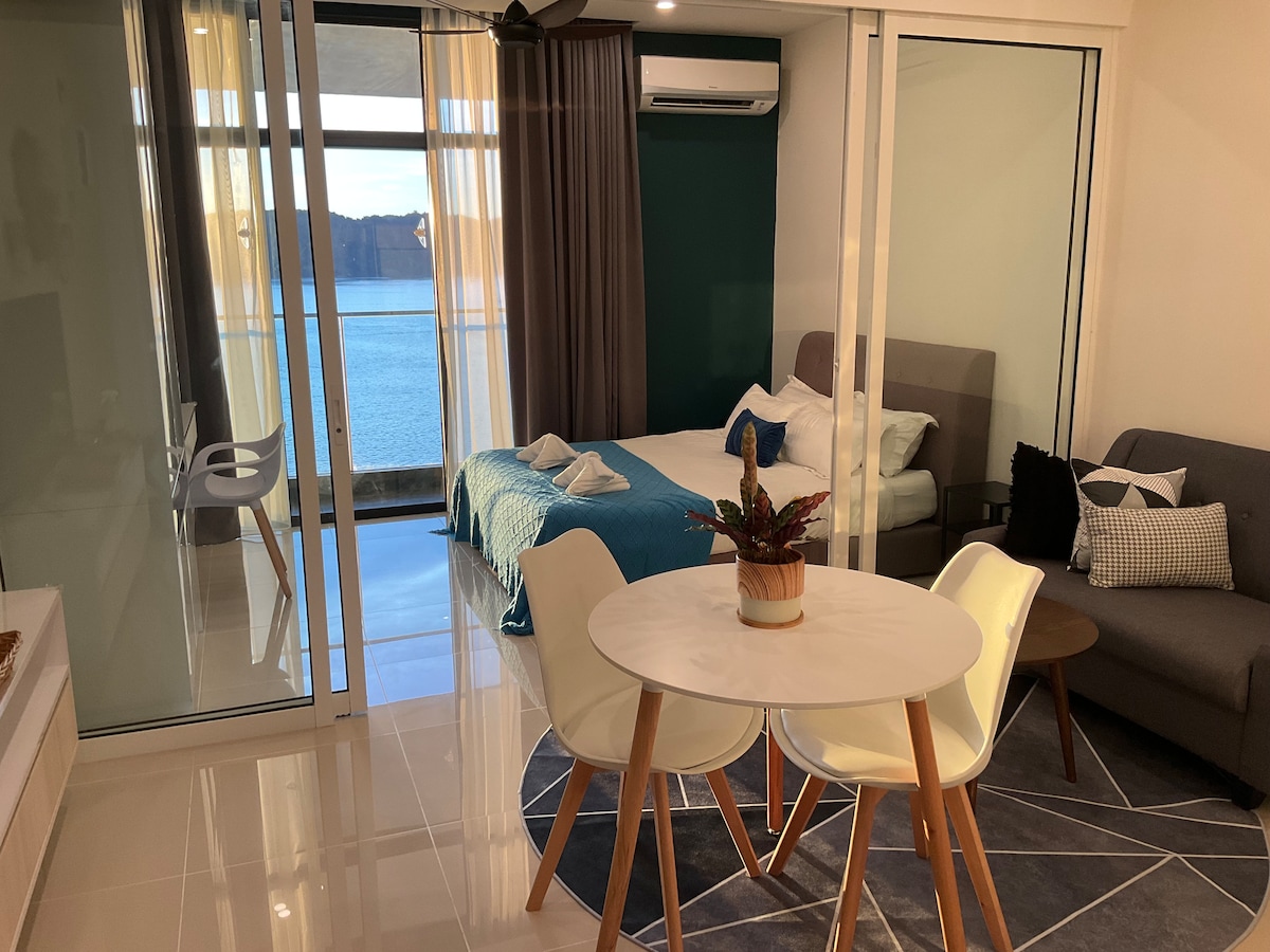 Bienvenido a Laxzone Suite, tu Airbnb preferido en Kota Kinabalu. Ubicada en el corazón del distrito financiero de KK, nuestra acogedora y elegante suite ofrece la combinación perfecta de comodidad y conveniencia para tu estancia. ¡Nuestra impresionante unidad cuenta con balcón y vistas al mar impresionantes! Puedes salir al balcón y dejarte cautivar por las vistas panorámicas del resplandeciente océano. Ya sea disfrutando de tu café por la mañana o viendo la puesta de sol. Reserva tu alojamiento hoy mismo y sumérgete en la belleza de Borneo.