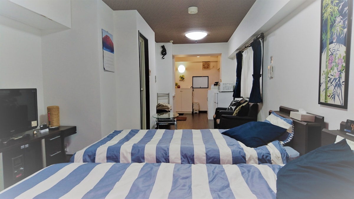 Apartamento ubicado en una ubicación muy práctica. Hay dos estaciones cercanas. A 6 minutos a pie de la estación más cercana, Yoyogi-Koen, donde puedes ir a Harajuku en 2 minutos en tren, y a 9 minutos a pie de la estación de Sangubashi, donde puedes ir a la estación de Shinjuku en 4 minutos en tren. Ofrece internet de alta velocidad y wifi GRATIS. Este apartamento es de llegada autónoma. Hay una cama de matrimonio y una cama individual en el dormitorio, y un sofá cama doble en la sala de estar.