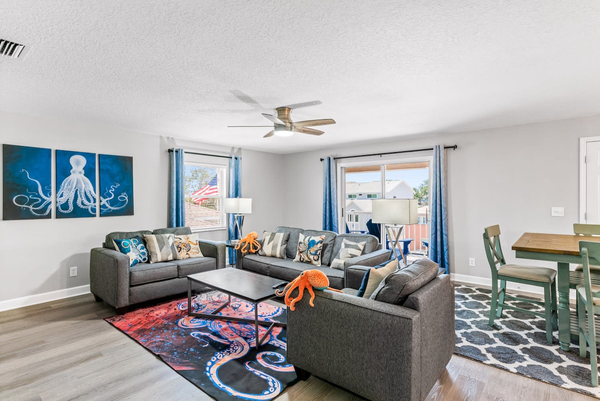 El Kraken es nuevo, con decoraciones Kraken de buen gusto para unir el espacio. Equipado con un gran televisor de 75 pulgadas, una gran habitación doble con cama tamaño queen y un dormitorio principal con cama tamaño king. El Kraken es la casa de playa perfecta para meter los dedos de los pies en el agua en cuestión de minutos, la comunidad de playa perfecta para caminar hasta la cocina local, con las comodidades perfectas de una casa. La planta del ático es para familias/grupos que quieran divertirse juntos con puestas de sol épicas perfectas para los amantes del sol.