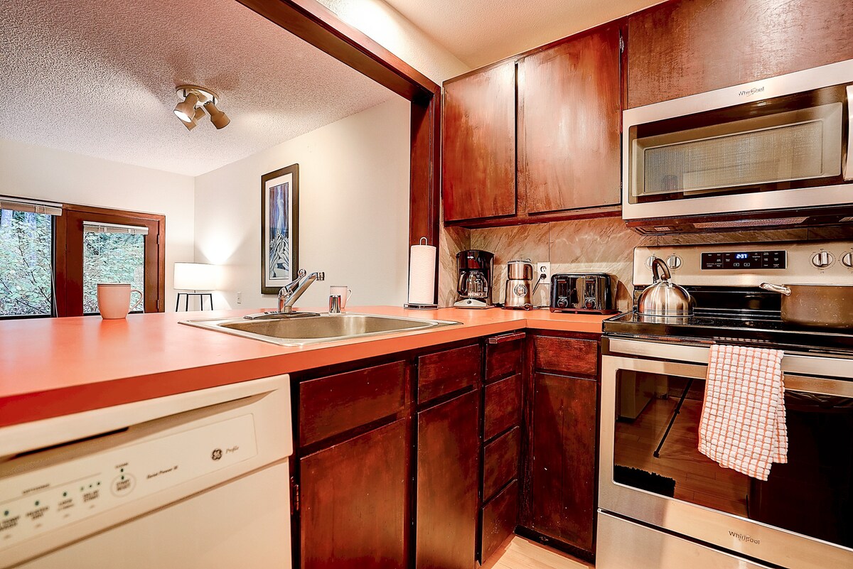Acogedor condominio DE TRONCOS. Ideal para llegar en familia a los asistentes. ¡Absolutamente NO ES un lugar para tener una fiesta ruidosa! Esta es una unidad familiar. Cocina lenta digital, olla de fondue, olla, sartenes, etc. Sauna y chimenea de gas. Hay una terraza para disfrutar de las vistas de la montaña, con barbacoa. Las camas tamaño queen son 100% de algodón egipcio y todas las almohadas son de calidad hotelera. Sala de recreo, televisión/juegos. Wifi y Netflix