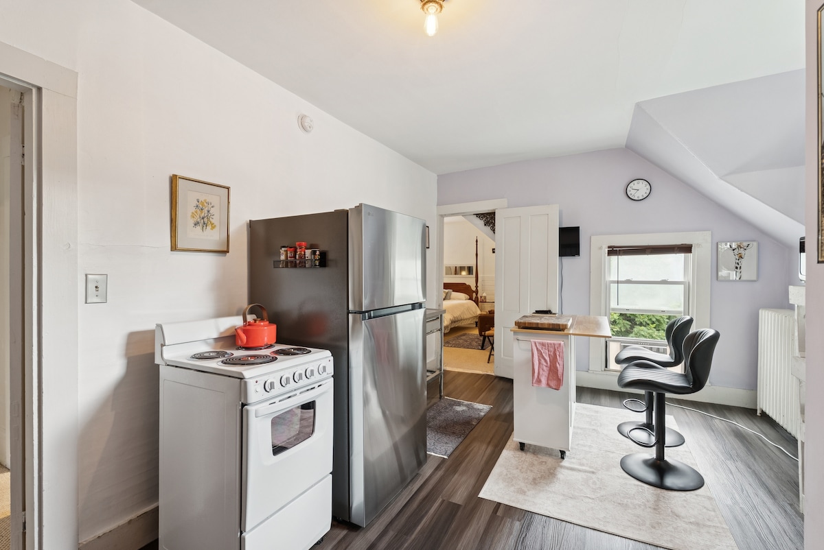 Disfruta de Hallowell y Central Maine mientras te hospedas en nuestro estudio. A poca distancia a pie del centro de Hallowell, a tiendas, restaurantes y pubs. Caminá por el sendero ferroviario de Kennebec. A 15 minutos en auto para visitar Maine Cabin Masters. A una hora en auto de Boothbay Harbor, Rockland o Belfast. El estudio se encuentra encima del garaje de los propietarios: entrada independiente y estacionamiento fuera de la calle. Incluye: sábanas, toallas, TV, WiFi, Keurig individual, microondas, tostadora, heladera de dormitorio tamaño universitario, refrigerador pequeño