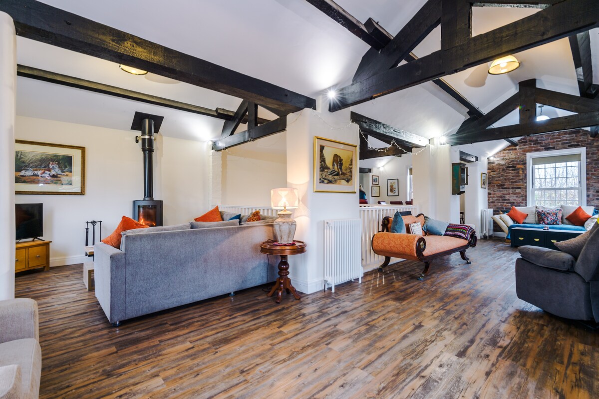 Beautiful barn retreat with hot tub and options for ~ spa treatments/massages/facials ~ private chef ~ pilates, yoga, zumba Ideal for couples, families/groups in the grounds of historic Oulton Smithy. Close to Oulton Park race circuit in the pretty Cheshire countryside. Beautiful woodland walks & country pubs nearby. The converted barn is set back from the Smithy with its own entrance, secure parking and a stunning private hot tub, it has two bedrooms & two en-suites. Luxury touches throughout.