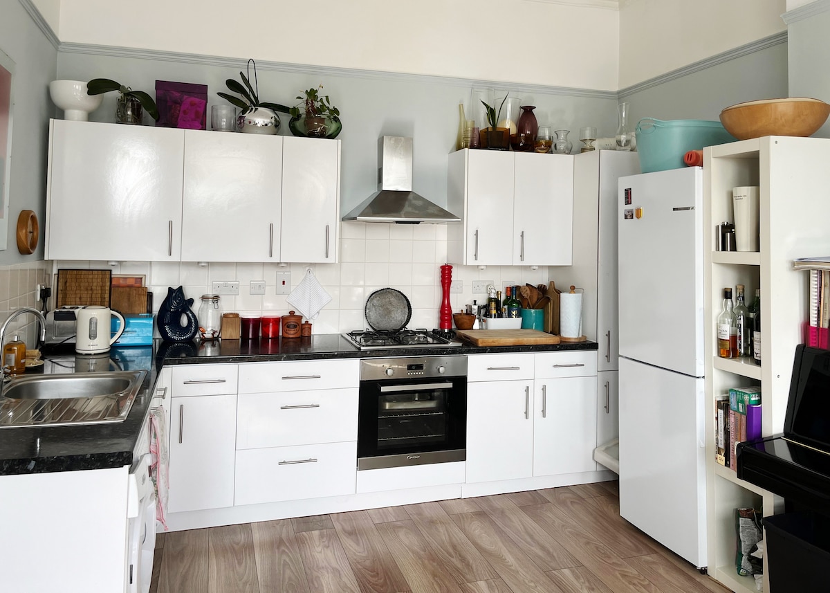 Hermoso y espacioso departamento de un dormitorio en el primer piso, de propietarios locales, con ventanas del piso al techo con vista a la playa, en la frontera de Hastings/St Leonards. A poca distancia a pie de los bares, restaurantes y tiendas del casco antiguo de Hastings, el centro de la ciudad y St Leonards. Capacidad para 2 personas en cama tamaño king con dosel; con bañera enrollable, ducha y cocina totalmente equipada, TV y wifi rápido. Estacionamiento gratuito cercano. Amplias recomendaciones para negocios locales que animamos a los huéspedes a usar. Toallas y sábanas proporcionadas.