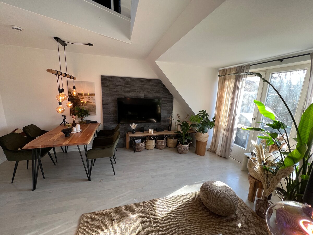 Departamento acogedor para un máximo de 9 personas. Tres dormitorios, todos posibles con su propia TV VÍA SATÉLITE y apagón debido a las persianas. Hermoso, totalmente equipado, cocina, sala de estar con lavavajillas, horno, estufa de cerámica, nevera, congelador, microondas, hervidor de agua, tostadora y cafetera, etc. Gran zona de estar hecha de madera maciza por el carpintero. Baño con ducha y dos lavabos. Inodoro separado. Jardín privado con kayak, zona de estar y trampolín. El estacionamiento está justo al lado del alojamiento.
