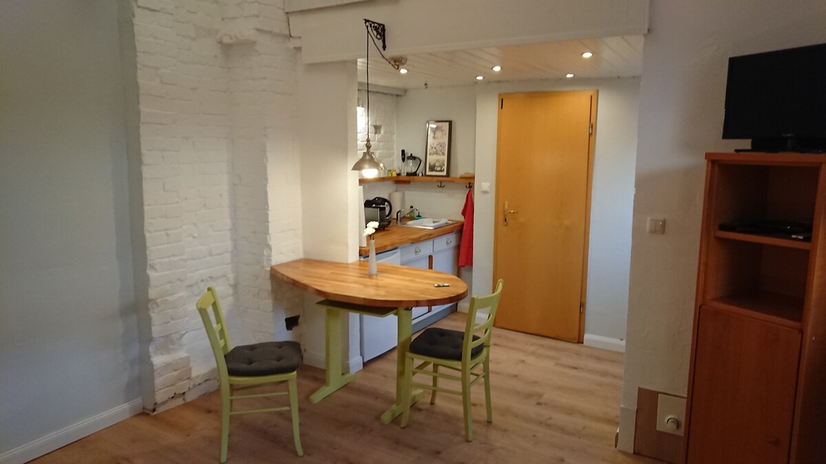 El alojamiento está situado en un pequeño edificio trasero con entrada independiente. Consta de una habitación con cama doble (1,80 x 2,0 m) y mesa de comedor, cocina americana y baño con ducha. Una pequeña terraza invita a relajarse en el jardín. Las bicicletas se pueden aparcar de forma segura en el patio trasero.