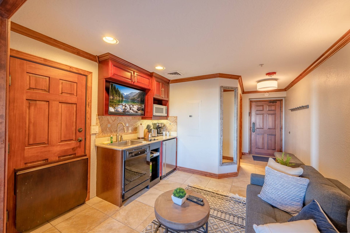 ¡La habitación King perfecta en la base de la montaña! Cocina americana, chimenea, TV de 58 pulgadas, bañera de hidromasaje con sales de baño y burbujas, sábanas y toallas de lujo, baño y cuerpo orgánicos, cocina americana totalmente equipada, ¡incluyendo un enfriador de vino! Mesa de bistró y asientos, vistas a la montaña, albornoces... la habitación de hotel perfecta para relajarse. Disfruta del jacuzzi y de la ubicación céntrica. Equipo de aparcacoches en el vestíbulo, transporte gratuito por el pueblo y parada de autobús urbano gratuita enfrente. Aparcamiento interior seguro, gimnasio, sauna, vapor, piscina climatizada...