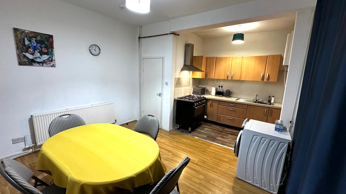 The room is newly refurbished and overlooks the back garden on a quiet leafy street in Old Trafford. The bed itself has a new 10 inch thick mattress ensuring the weary traveller has an excellent nights sleep ! You will wake up to the sound of birdsong:) There is a large kitchen and dining area, a day room on the first floor and a shared bathroom/toilet. There is 1 additional person in the adjacent bedroom