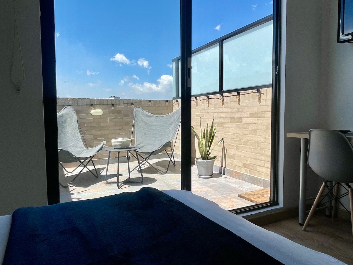 Moderno apartaestudio en Chapinero Central, con una hermosa terraza privada que ofrece una vista parcial a los cerros orientales de la ciudad, perfecta para tomar el sol durante el día o disfrutar de una agradable cena al aire libre en la noche. Además, disfruta de una pequeña chimenea, ideal para las noches frías en Bogotá.