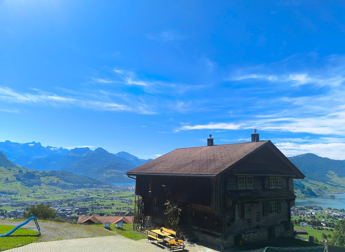 El chalet se encuentra a 750 metros sobre el nivel del mar, sobre Schwyz. Paz, privacidad y un telón de fondo de montaña impresionante, perfecto para escapar del estrés de la vida cotidiana. Una casa de protección de la patria de 200 años, que permaneció en gran parte en su estado original y pertenece a la historia suiza, bien mantenida, pero antigua. Elevado sobre el valle, ofrece magníficas vistas de las montañas y el valle. El lugar emana una tranquilidad especial y tiene mucha energía positiva. Como no hay vecinos inmediatos, no te molesta absolutamente nada”.