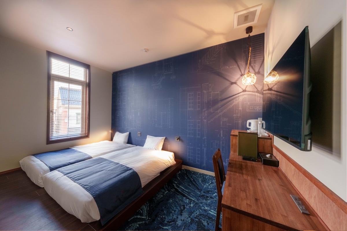 Built in 1920, this wooden building once served as a marine products office in Hakodate. Reborn after a century as T9 HAKODATE — a heritage hotel with just five rooms, 3 min from Kanemori Red Brick Warehouse. Each room draws from Hakodate's landscapes and history. One of those five is Midori — capturing the deep green of Mount Hakodate as seen from the hotel windows. Two semi-double beds for two guests. Let the quiet presence of the forest ease you into rest. A stay wrapped in nature awaits.