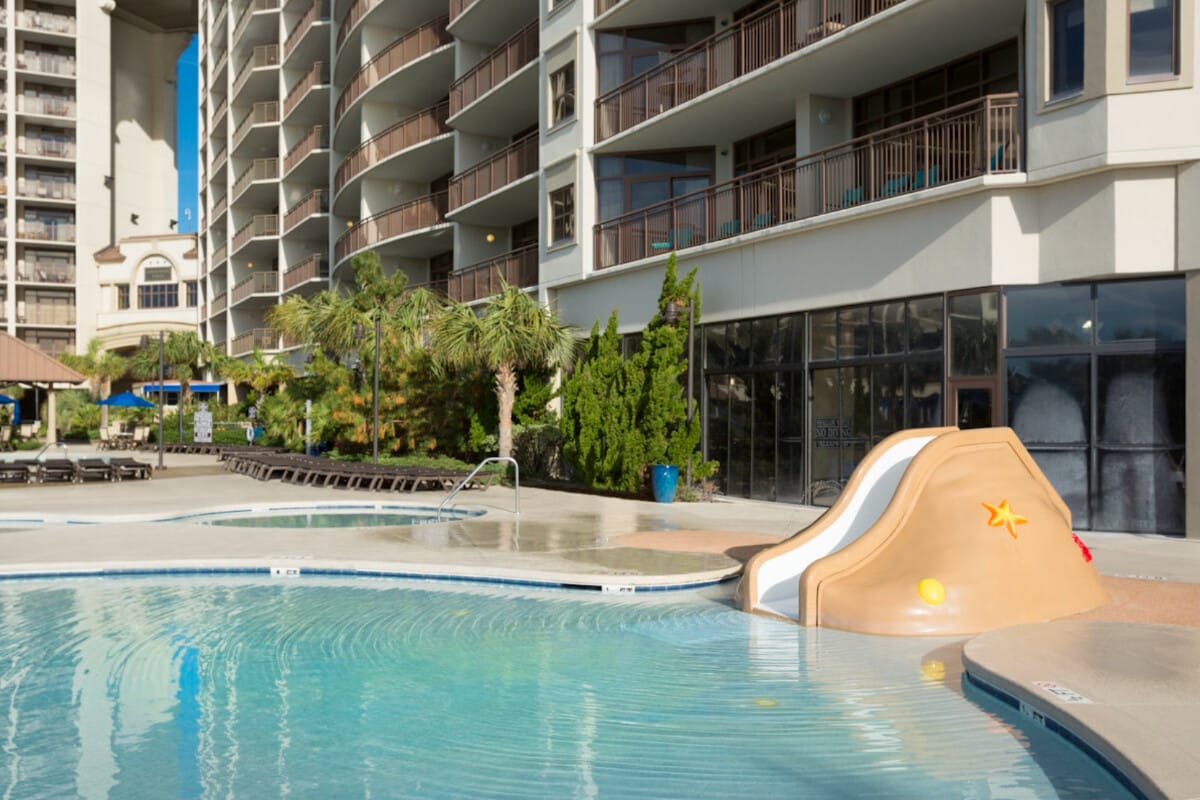 Villa vacacional de lujo en North Beach Resort & Villas, North Myrtle Beach. Felicidad frente al mar de 60 acres con suave playa de arena blanca, refrescante agua salada calentada por el arroyo del Golfo y el sol durante todo el año. 2,5 acres de comodidades de la piscina de temática caribeña con múltiples piscinas, gran espacio para tomar el sol, cabañas personales con servicio de mayordomo, bañeras de hidromasaje y un bar en la piscina. ¡The Grand Strands Only Swim-Up Bar! Nada todo el año en el complejo de piscinas cubiertas con un río lento.