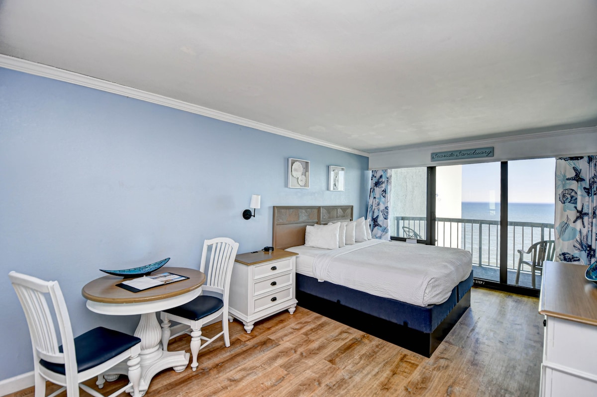 Apartamento tipo estudio recién renovado en el centro vacacional Bay View. El apartamento está situado en el centro, entre la 5ª y la 6ª avenida, a poca distancia a pie del CCMF en junio. ¡Impresionantes vistas directas al mar! Este apartamento incluye una cama tamaño king, bar, pequeña sala de estar y balcón con vista directa al mar. Los servicios del edificio incluyen piscinas cubiertas y al aire libre y jacuzzis, río lento interior, chimenea al aire libre, gimnasio y garaje cerrado independiente.