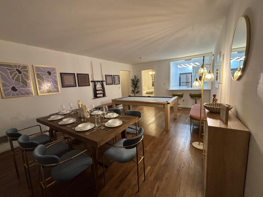 Beautiful and classy retreat just minutes from NYC. This spacious home features 3 bedrooms with 4 beds, 1.5 baths, a game room with pool table, private theater room, dining space for 8, and a relaxing backyard. Perfect for families, business trips, or vacation getaways seeking comfort, entertainment, and convenience near the city.