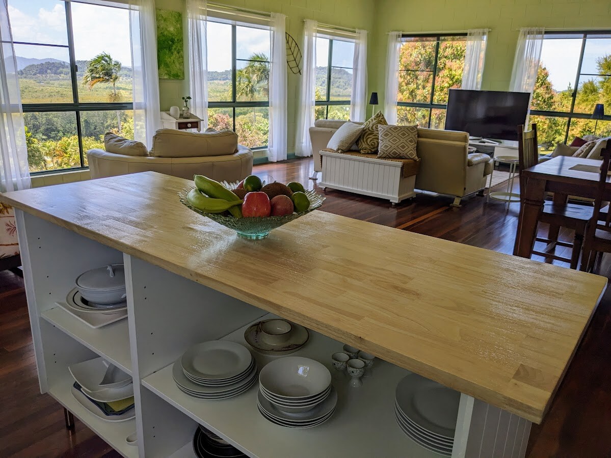La tarifa diaria es para una pareja que utiliza el dormitorio king. Si quieres usar un dormitorio adicional, son 30 dólares por persona y noche. Reserva con la tarifa de persona adicional. Moderna casa de campo de estilo tradicional de Queensland, a solo unos minutos en coche de la playa, cafeterías, restaurantes y tiendas minoristas. Relájate en nuestra granja de frutas orgánicas con impresionantes vistas a la selva tropical patrimonio de la humanidad. Hay pequeños toques para que te sientas bienvenido y a gusto. Espacio suficiente para familias.