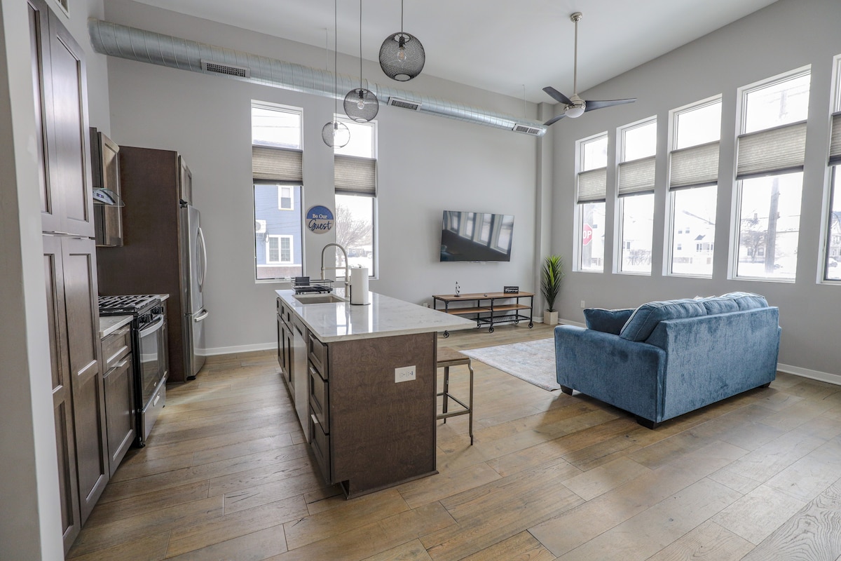 Experience the best of city living at our stylish 1-bedroom downtown Cleveland condo. This modern-organic space features 14-foot ceilings, hardwood floors, and large windows, creating a bright and airy atmosphere. Our condo includes 1 queen sized bed, and 1 couch. Located in the heart of downtown, you're steps away from top dining, shopping, and entertainment venues. Ideal for both business and leisure, our condo provides the perfect urban retreat. WALKING DISTANCE TO ALL CLEVELAND ARENAS!!