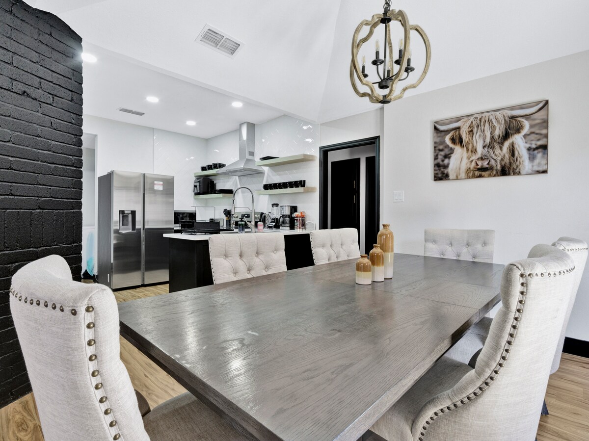 ¡Te damos la bienvenida a nuestro elegante Airbnb con temática de Texas! Con una ubicación céntrica, nuestra elegante propiedad cuenta con una hermosa decoración y muchas comodidades para proporcionarte una estancia relajante. Relájate en la gran habitación con un televisor inteligente de 65 pulgadas, prepara una comida inspirada en Texas en la cocina totalmente equipada o disfruta del gran patio trasero totalmente vallado. Disfruta de una noche de sueño reparador en uno de los cómodos dormitorios. A poca distancia del aeropuerto DFW y de innumerables atracciones, ¡experimenta el encanto y la comodidad del sur en el corazón de Texas!