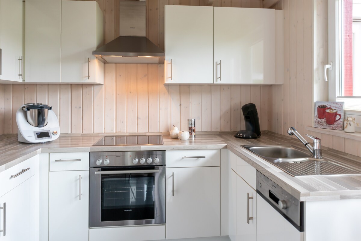 El Hygge Hus ofrece en 105 m² tres dormitorios con dos lugares para dormir cada uno, un baño con ducha y uno con bañera, así como una gran cocina, sala de estar con chimenea. Hay una caja de arena, un gran columpio y en dos lados terrazas de madera con muebles de madera de alta calidad. Gracias a una valla envolvente, los bebés no pueden escapar de ti. Se puede utilizar la trona y el bote de viaje para niños si es necesario. Todas las ventanas de la parte trasera son de piso a techo.