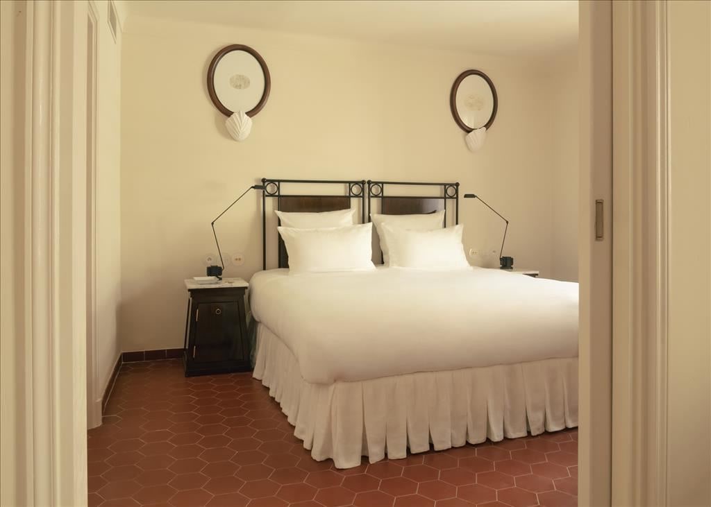 Refined, with white and beige colors, it invites calm and tranquility. It is a large room with high ceilings that overlooks the patio. A wardrobe to store your belongings and take possession of the place, a desk to write, draw, or dream: this is the room of the regulars. Louis de Funès used to come here to take a break during the shooting of The Troops of Saint-Tropez.