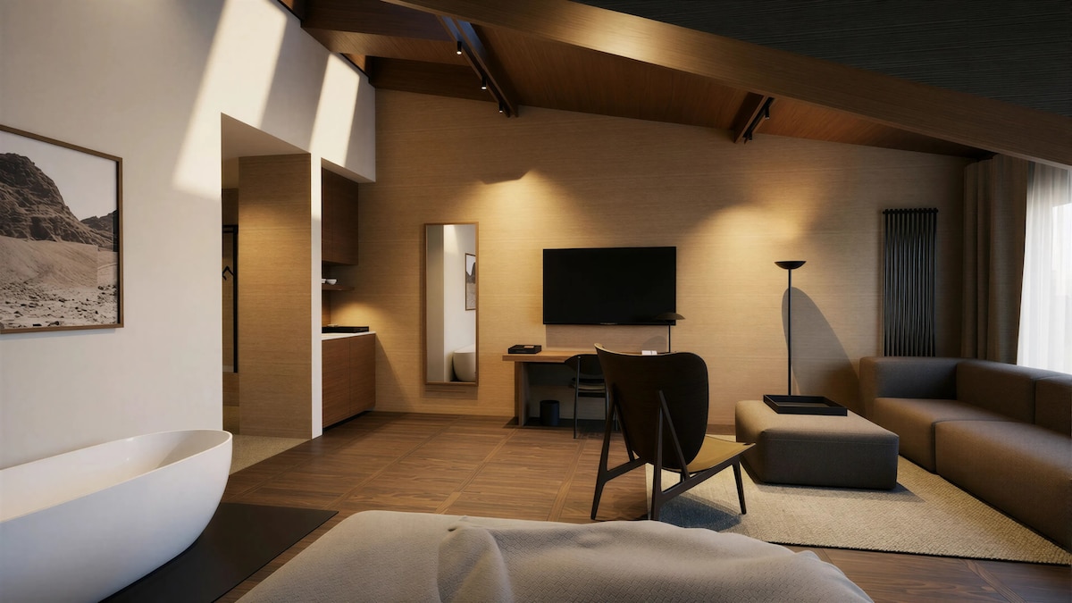 Spacious suite in a brand-new hotel with a relaxing nature view and a bathtub in the room. Accommodates up to 3 guests with a king-size bed and a single sofa bed. Features a private bathroom with toiletries, minibar, and gym kit. Breakfast buffet is included daily. An extra bed is available for a 3rd person.