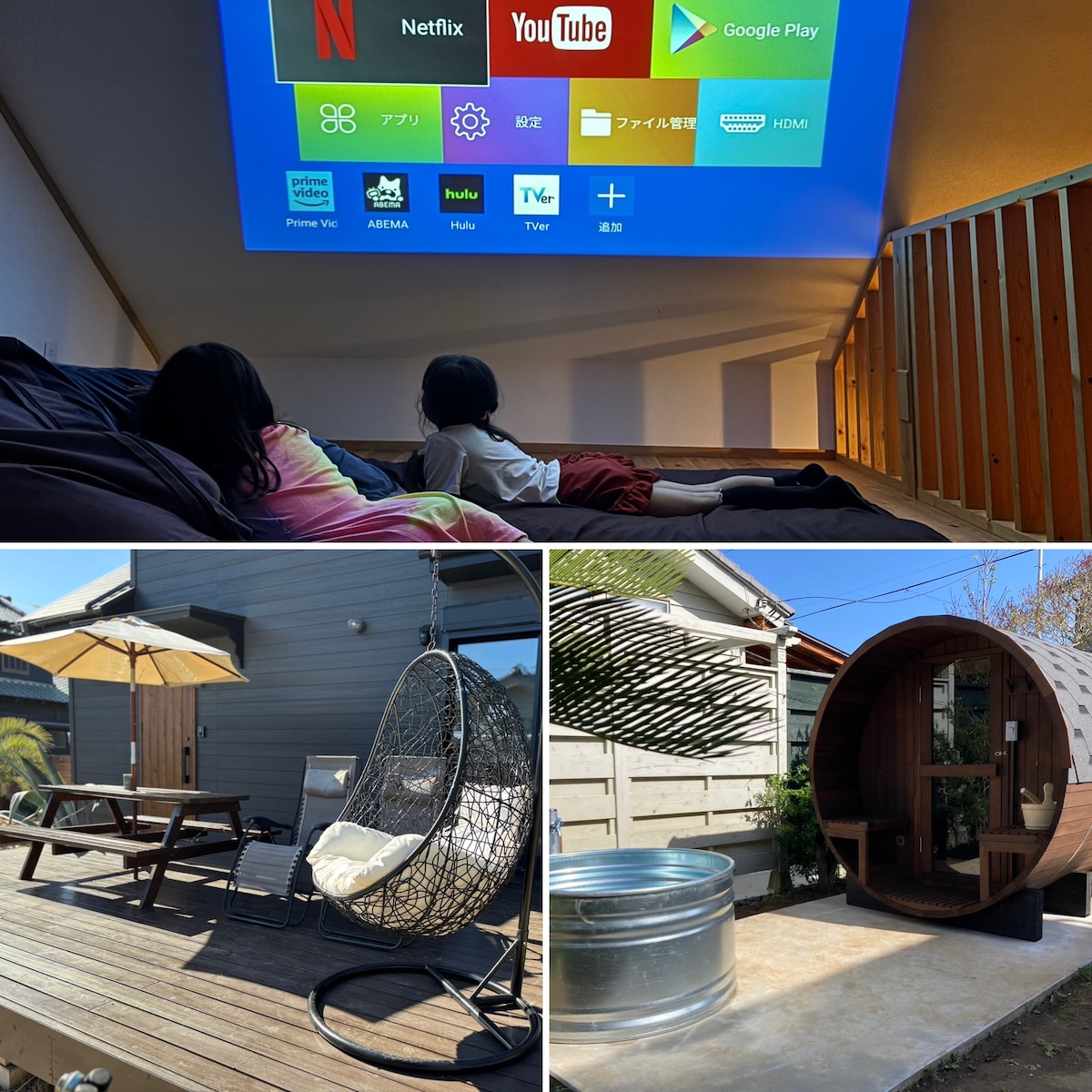 🌊東浪見海岸すぐ。大人も子どももくつろげる——1日1組限定の貸切別荘✨ 波の音に包まれる、プライベートな滞在を。 バレルサウナ(通常ロウリュ使用で100〜110℃)やBBQ(※BBQとサウナはオプション)と広々としたウッドデッキが魅力の、完全貸切の別荘です。 釣ヶ崎海岸や東浪見海岸など、ハイレベルな波を楽しめるサーフスポットにもアクセス抜群。 洗練されたカフェやレストランが点在し、美食と自然が調和するエリアです。 日が暮れたら、星降る空を眺めながらサウナで“ととのう”。 プロジェクターで映画を楽しんだり、仲間とワインを傾けながら語らう時間もまた格別。 静けさの中で、自分たちだけの豊かな時間をお過ごしください。 お子様連れ・ペット連れのお客様もご滞在いただけます。 ※お車でのアクセスが便利です。 ※ 自然に囲まれた立地のため、季節や天候によっては虫が出ることもございます。 苦手な方は、あらかじめその点をご承知のうえでご予約ください。