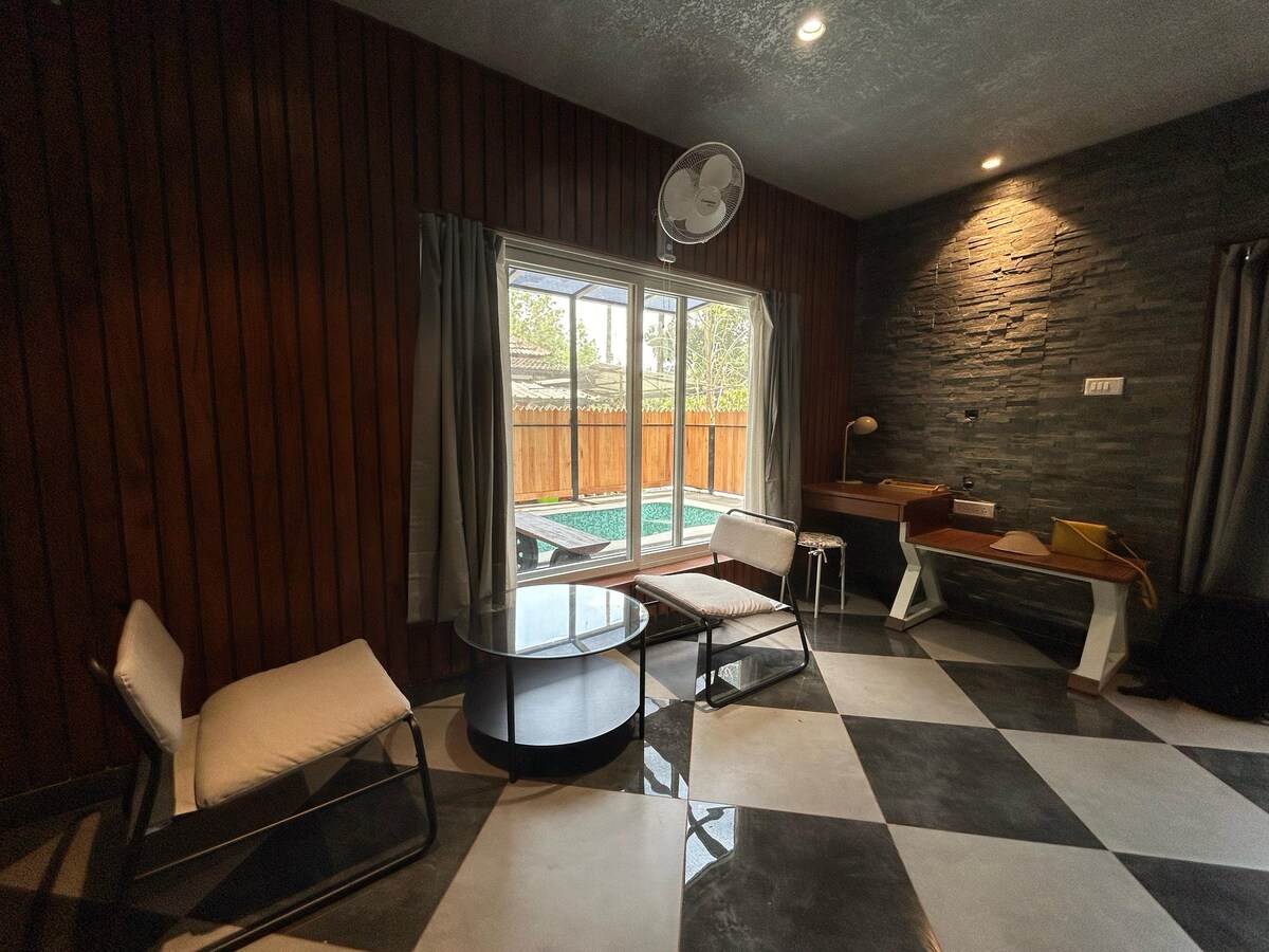 Kayyath Valley Munnar is a 4BHK luxury hillside sanctuary nestled in lush greenery of Anachal. This elegant villa offers spacious bedrooms, stylish living areas, a fully equipped kitchen, and scenic balconies with breathtaking views. Enjoy a serene atmosphere with modern comforts like an outdoor swimming pool, fitness centre, and children's play area. With attentive hosts, and easy access to Munnar’s attractions, it's the perfect retreat for families and groups.