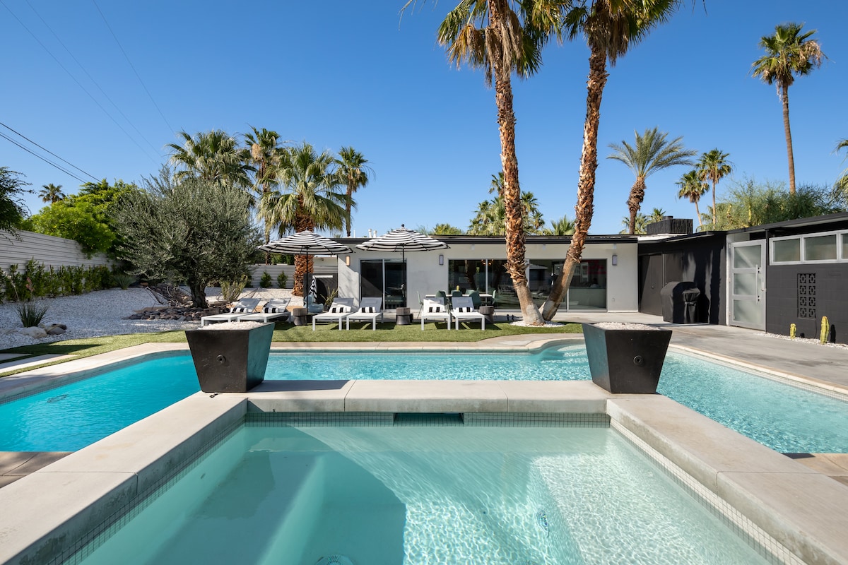Ambiente moderno de mediados de siglo con piscina y spa en el patio trasero