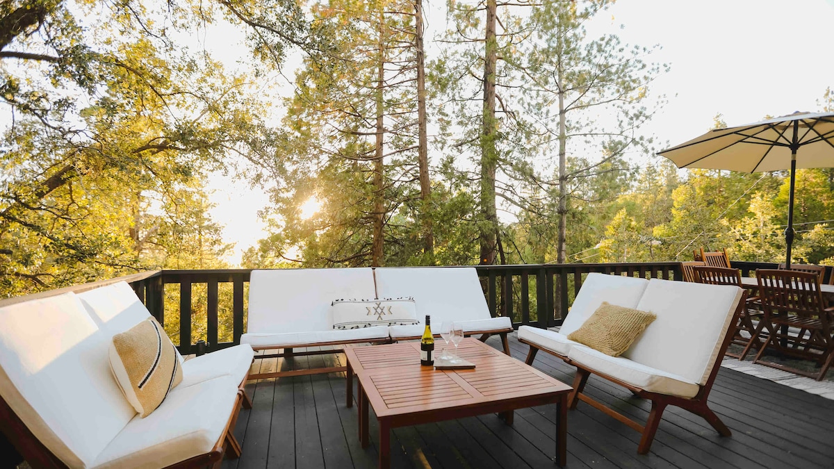 Perched high on Idyllwild’s North Ridge, Treetop Terrace sits in a canopy of oak trees and offers amazing views from its expansive upper deck. Enjoy the charm of its mid-century architecture and vintage-inspired furnishings. Features include floor-to-ceiling windows, an open-concept layout, a recreation room, and wheelchair accessibility. Conveniently located 3-minutes from the village, it is easy to enjoy the charms of Idyllwild and the beautiful San Jacinto mountains from the Treetop Terrace.