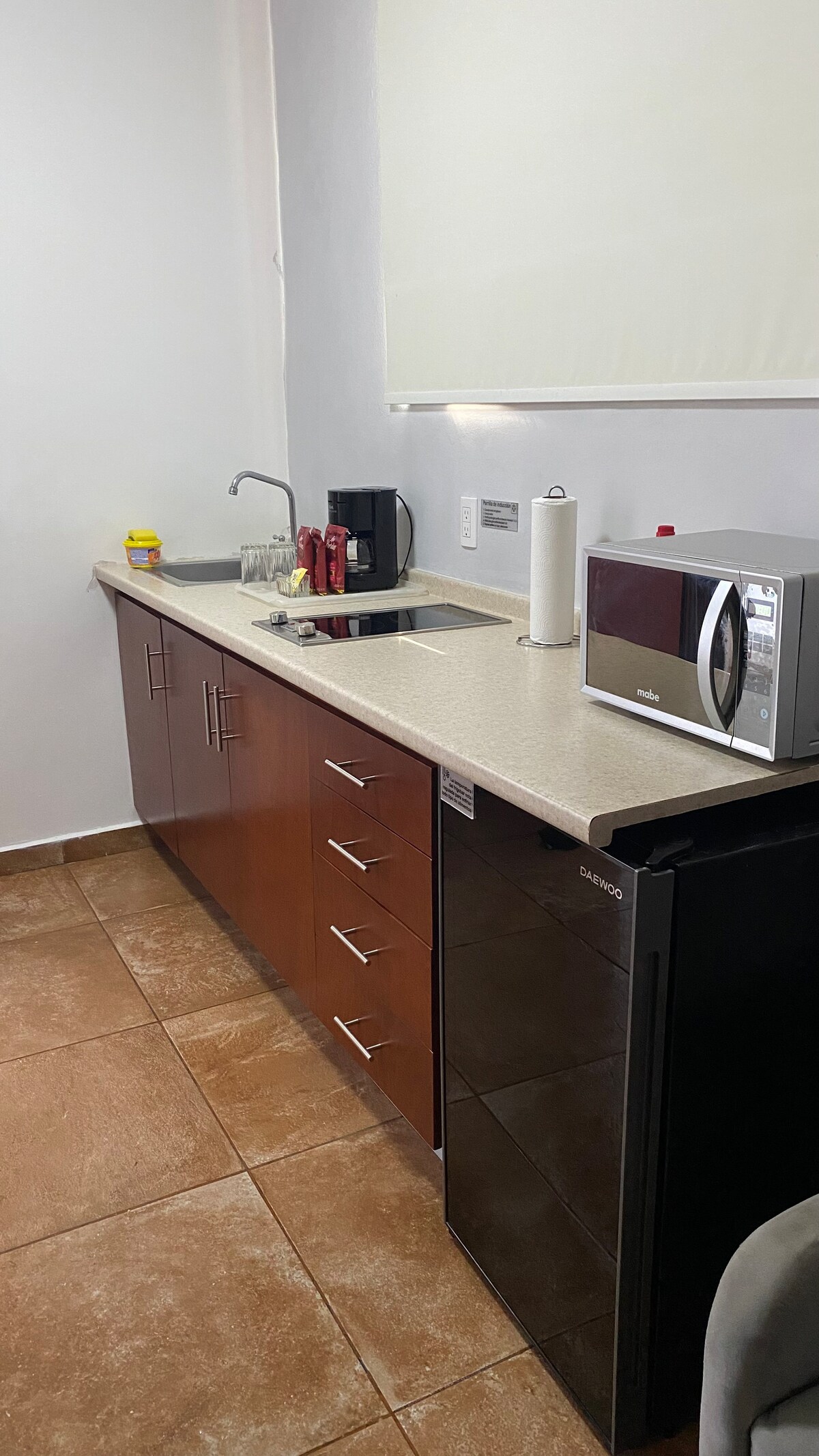 Limpieza profunda antes de cada reservación y desinfectada con producto certificado por COFEPRIS. Dispensadores de gel antibacterial en las áreas comunes. Espacio cálido y hogareño, con servicios para permanecer estancias largas y sentirte como en casa. Cuenta con una cama matrimonial, baño propio, aire acondicionado, closet, cocina equipada con cafetera, parrilla eléctrica, refrigerador, vajilla, microondas y plancha. NO CONTAMOS CON ESTACIONAMIENTO