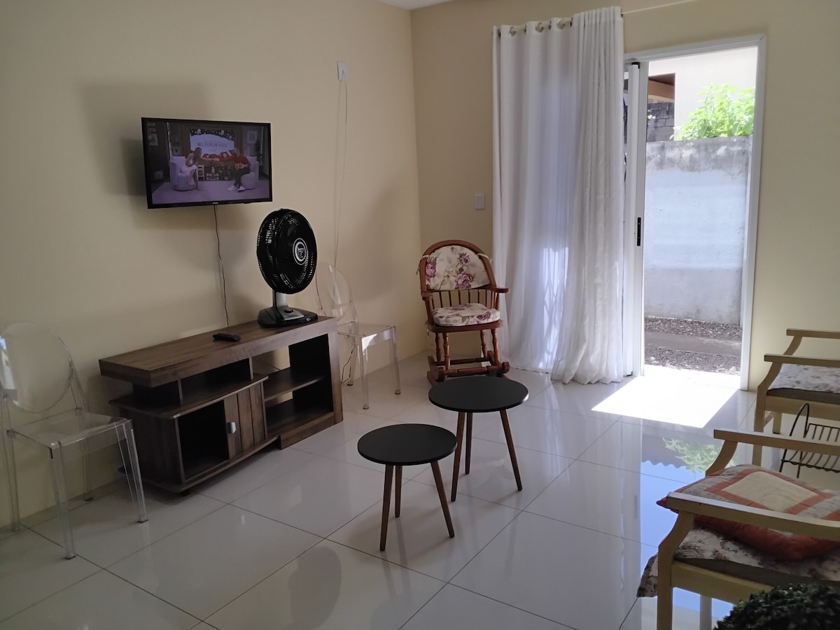 ¡Relajate con tu familia o después de tu día de trabajo! Casa con una ubicación perfecta. Cerca de mercados, panadería, árbol frutal, farmacia, parada de autobús. Alojamiento con espacio para alojar a 3 personas tranquilamente, tiene cocina, living, dormitorio y baño y aire acondicionado. El alojamiento también tiene terreno cubierto de hierba, tanque de ropa, área de barbacoa y garaje cubierto. Las llaves de la casa y la puerta del garaje son de acceso exclusivo de los huéspedes a través de la calle lateral. Ambiente limpio, hermoso y tranquilo.