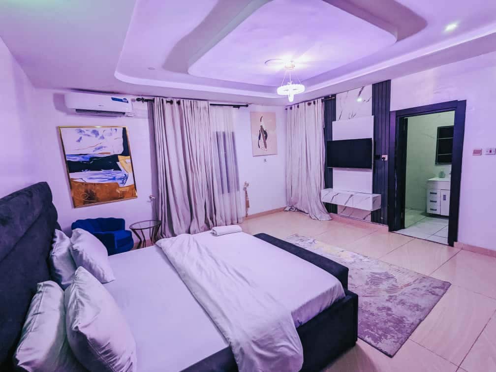 A Brand New ,Well Finished 1 bedroom apartment for Short let. It a perfect place for business traveler with discerning tastes looking for excellent value accommodation. Features: * All rooms ensuite * WiFi * Front water view * Onsite maintenance & house keeping * Elevator * Fitted Kitchen * Ample parking * Cctv * 24hours Power Supply * Fitted Air Conditioners * Fire alarm system